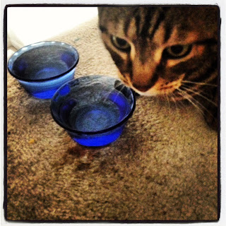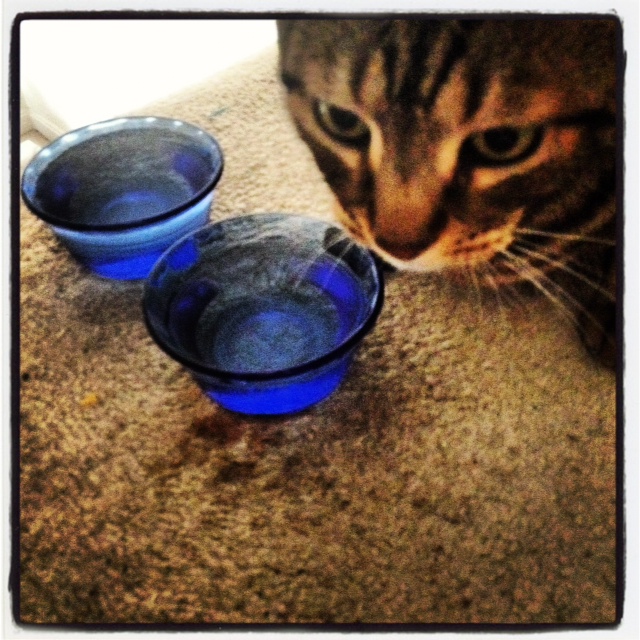 Jackson will only drink from one type of bowl, little glass cups that I normally make flan in. He always wants TWO bowls as well, though he normally only drinks from one of them while the other just kinda sits there.